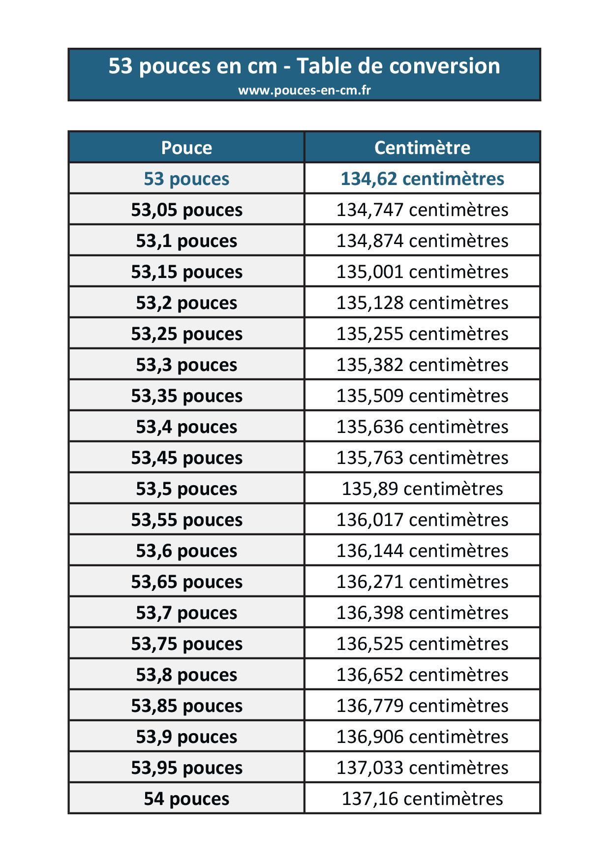 Comme 1 pouce équivaut à 2,54 cm il faut pour convertir 53 pouces en centimètre multiplier 53 par 2,54 : 52 pouces x 2.54 cm = 134,62 cm.