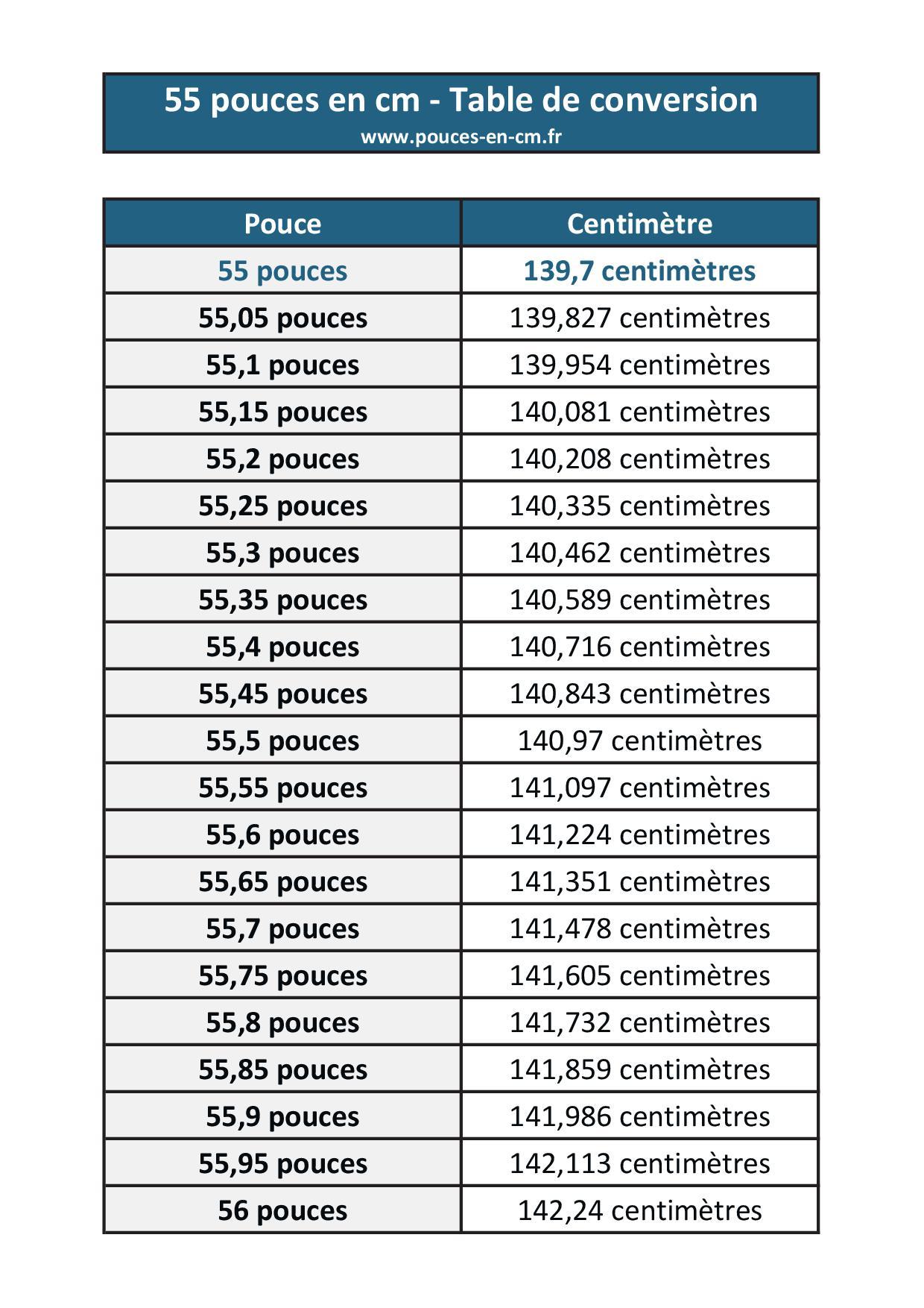 Comme 1 pouce équivaut à 2,54 cm il faut pour convertir 55 pouces en centimètre multiplier 55 par 2,54 : 55 pouces x 2.54 cm = 139,7 cm.