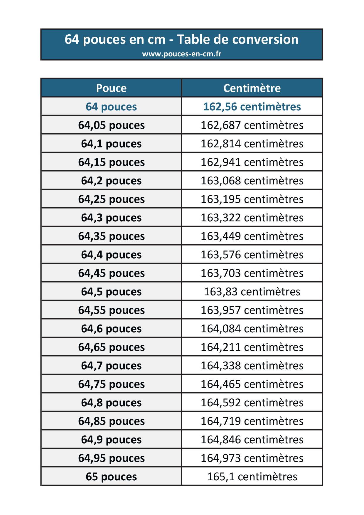 Tableau de conversion 64 pouces en centimètres
