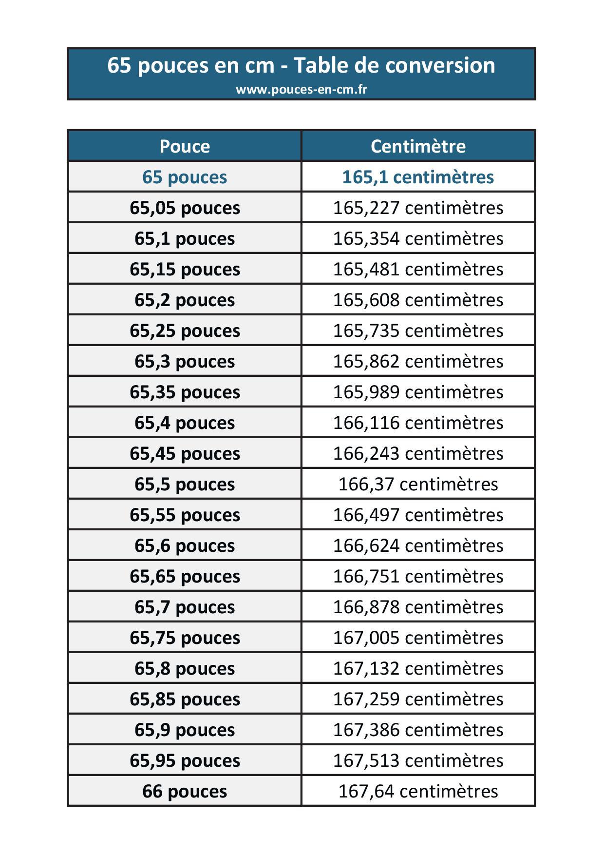 La table de conversion 65 pouces en centimètre que vous pourrez télécharger ci-dessous vous permettra de consulter la conversion de longueurs comprises entre 65 et 66 pouces.